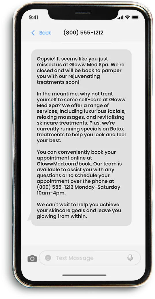 For starters, it enhances customer service by ensuring no call goes unanswered, improves engagement by providing immediate response, and can increase lead conversion by keeping potential customers engaged. A MIT study found that after 5 minutes pass, the odds of connecting with a customer drop by 80%. Furthermore, responding to leads within the first-minute increases conversions by 391%. So, if you’re missing calls from prospects, you’re likely losing them to your competitors. We have solved this problem and taken it a step further with our incredible AI solution. Now, not only do we instantly connect with every missed call, we offer a super low cost solution to have full conversations and even book appointments.